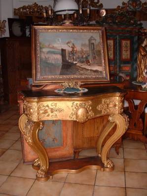 consolle veneta dorata in legno della fine del 1700 con un quadro su tela del 1700
